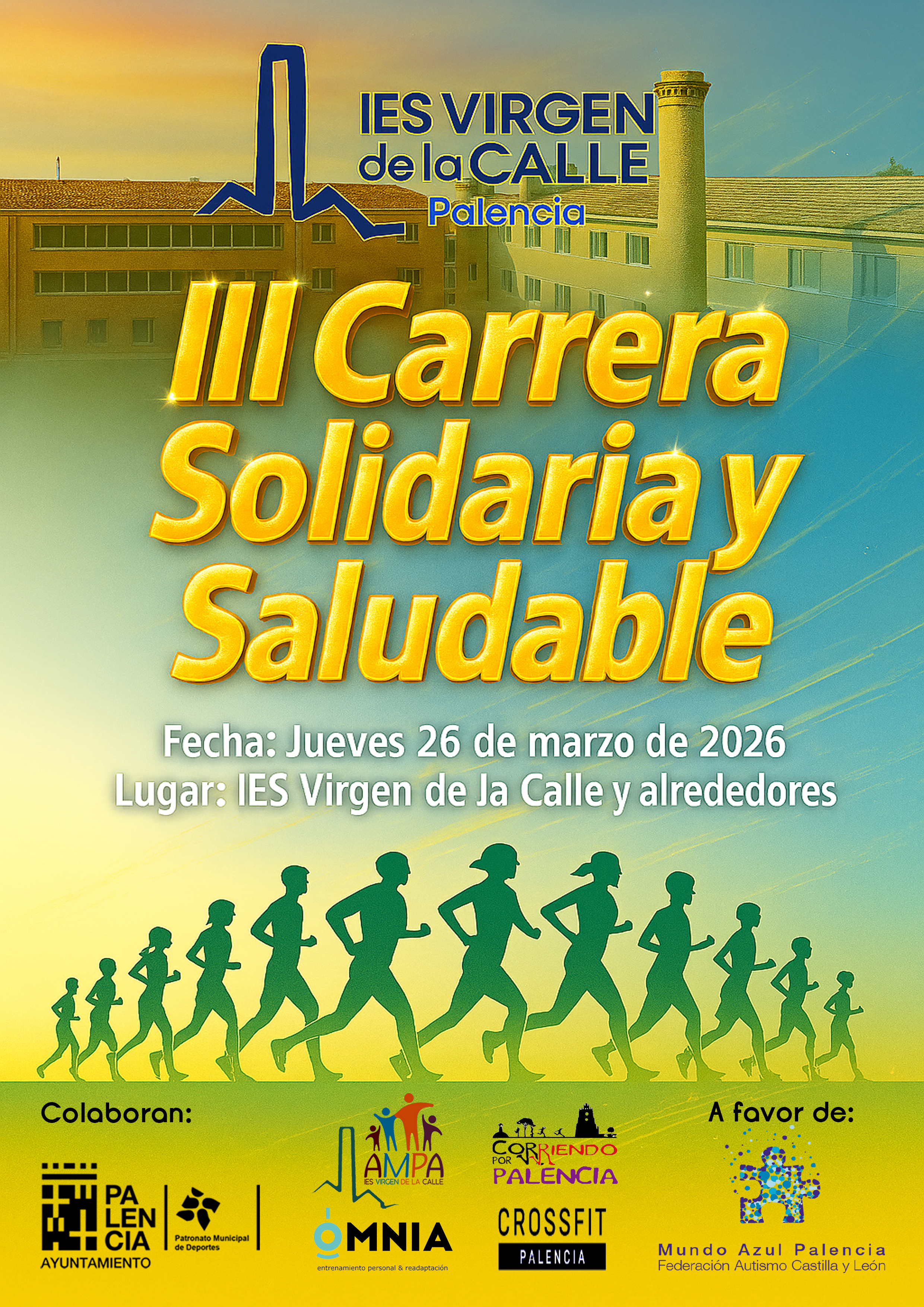 El próximo jueves 26 de marzo de 2026 se celebrará la III Carrera Solidaria y Saludable, organizada por el IES Virgen de la Calle. Esta actividad está abierta a todos los miembros de la comunidad educativa y cuenta con la colaboración del Ayuntamiento de Palencia, el AMPA, Corriendo por Palencia, Crossfit Palencia y Omnia Entrenamiento Personal y Readaptación.
